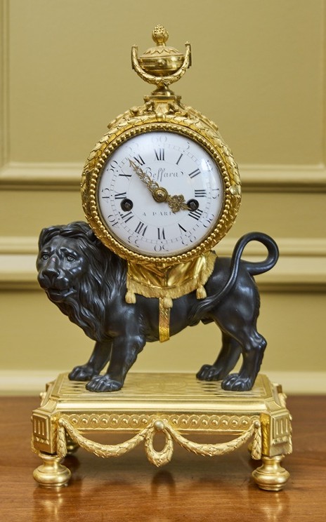 Pendule au lion en bronze ciselé, doré et patiné. Elle présente un lion couvert d’une étoffe sur son dos, soutenant le mécanisme. Le boitier, surmonté par une urne, est orné d’un rang de perles, d’une guirlande de lauriers et d’un ruban noué. L’ensemble repose sur un socle néoclassique à pied toupie, décoré de frises d’entrelacs et soulignées de larges guirlandes de lauriers. Le cadran et le mouvement sont signés de Beffara à Paris