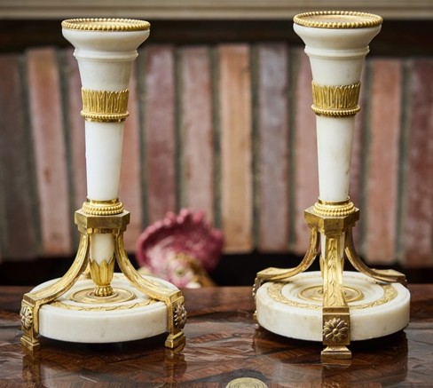 Paire de flambeaux en bronze ciselé, doré et marbre blanc, formant un carquois embelli de frise de feuilles d’eau, de bagues, de rangs de perles et d’une graine. Il est soutenu par un piètement tripode orné de feuillages et de fleurs de tournesol, réunis par une base circulaire moulurée, enrichie d’une frise de lauriers.