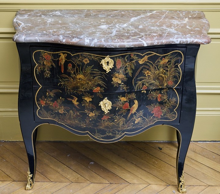 Commode galbée en vernis Européen à l’imitation de la laque japonaise, ouvrant par deux tiroirs à traverse en retrait. La façade présente un large cartouche orné d’oiseaux, de feuillages et de fleurs, exotiques. Les côtés dessinent des cartouches décorés de paysages lacustres, bordés de rochers et arborés de pins. Ils sont soulignés de filets qui descendent sur les arêtes des pieds. Les montants droits, arrondis pour les postérieurs et courbes pour les antérieurs, reposent sur des pieds cambrés. Dessus de marbre rouge royal à corbin. Entrées de serrures et sabots enchâssés en bronze ciselé et doré.Estampillé. DELORME (sur l’arase du montant antérieur et postérieur gauche).